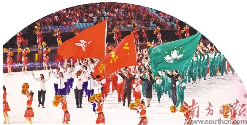 去年11月9日晚,十五运会开幕式上,广东、香港、澳门体育代表团携手入场。南方日报记者 苏韵桦 摄